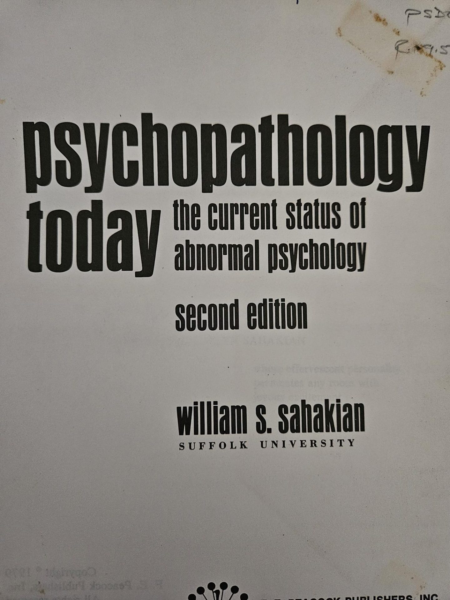 Psychopathology Today, The Current Atatus Of Abnormal Psychology, 2nd Edition, William S Sahakian, FE Peacock Publishers Inc, 1979 ,